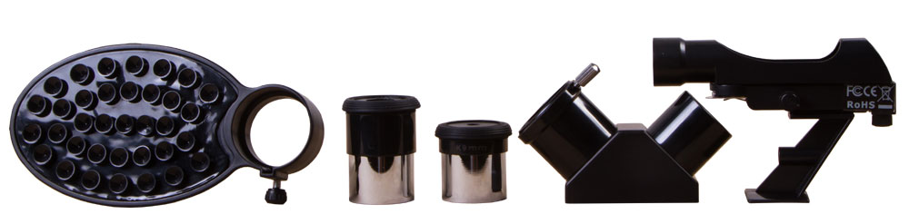 Классическая оптическая труба прибора снабжена ахроматическими линзами с многослойным покрытием на основе фторида магния. Модуль частично избавлен от хроматических и сферических аберраций, поддерживает максимальное полезное увеличение до 140 крат без потери качества изображения. В комплекте поставки тубуса идут два окуляра 9 и 20 миллиметров, а также оптический искатель с центрированной красной точкой, упрощающий процесс наведения на выбранный участок неба.