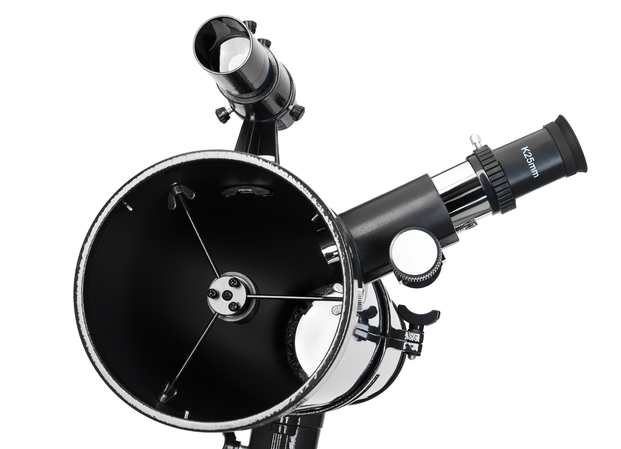 Тренога сделана из алюминия и устойчиво стоит даже на неровной поверхности. По центру есть лоток для аксессуаров – в его отсеках можно зафиксировать окуляры и линзу Барлоу. Все это уже есть в комплекте, а при необходимости прибор может быть дооснащен дополнительными принадлежностями. Диаметр реечного фокусера стандартный – 1,25 дюйма, что обеспечивает широкую совместимость с аксессуарами. Также в комплекте есть книга знаний – отличный подарок для тех, кто хочет узнать больше об объектах, наблюдаемых через окуляр телескопа.