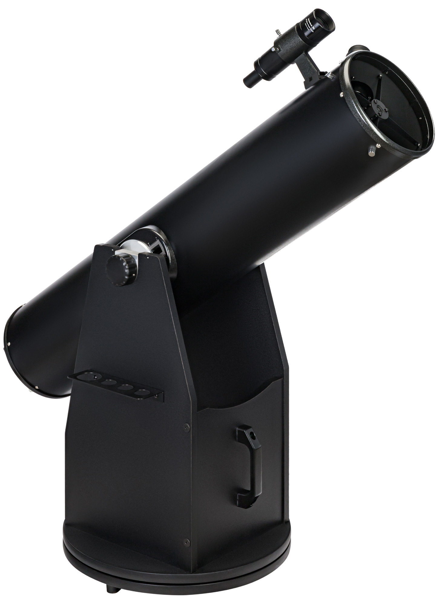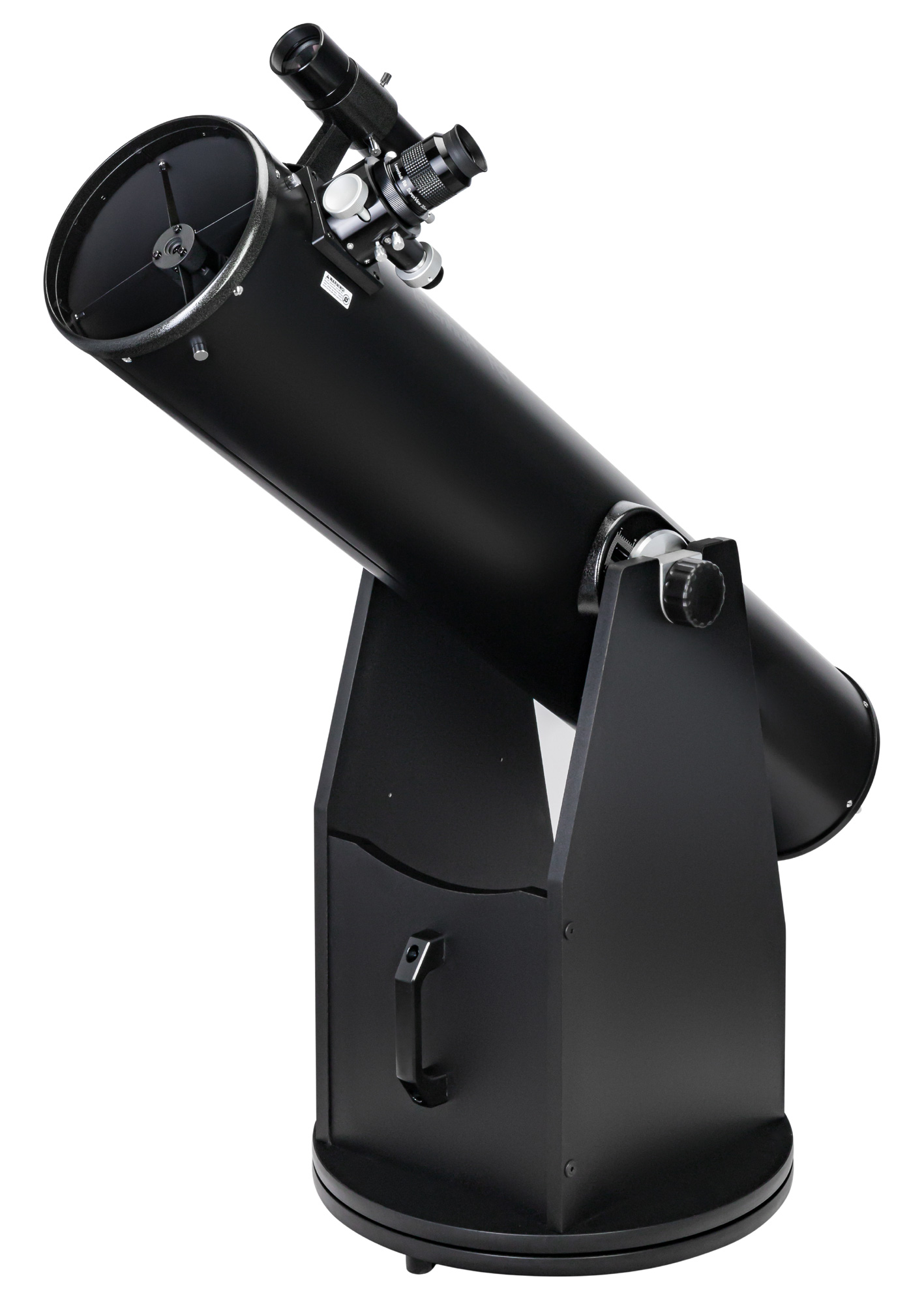 Монтировка телескопа – это классический Добсон. Она имеет привычный внешний вид, обладает всеми достоинствами этого типа монтировок, но при этом значительно доработана в плане механики. Особая система высотных подшипников и балансировки позволяет перемещать оптическую трубу на несколько сантиметров вверх или вниз. При использовании дополнительного навесного оборудования это позволит быстро сбалансировать телескоп и добиться максимальной устойчивости.