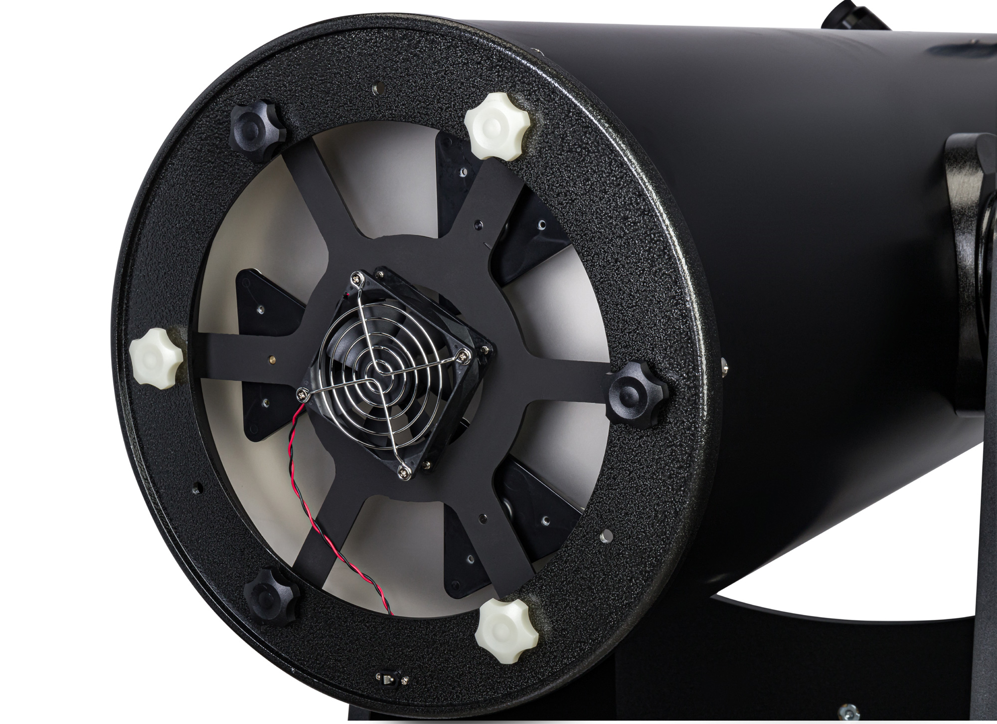 На тыльной стороне трубы расположен вентилятор. Он используется для ускорения термостабилизации главного зеркала. В обычных условиях, чтобы сравнять температуру оптики с температурой окружающей среды, может понадобиться несколько часов. Но активное охлаждение сократит это время практически вдвое. Вентилятор работает от батареек, которые приобретаются отдельно.
