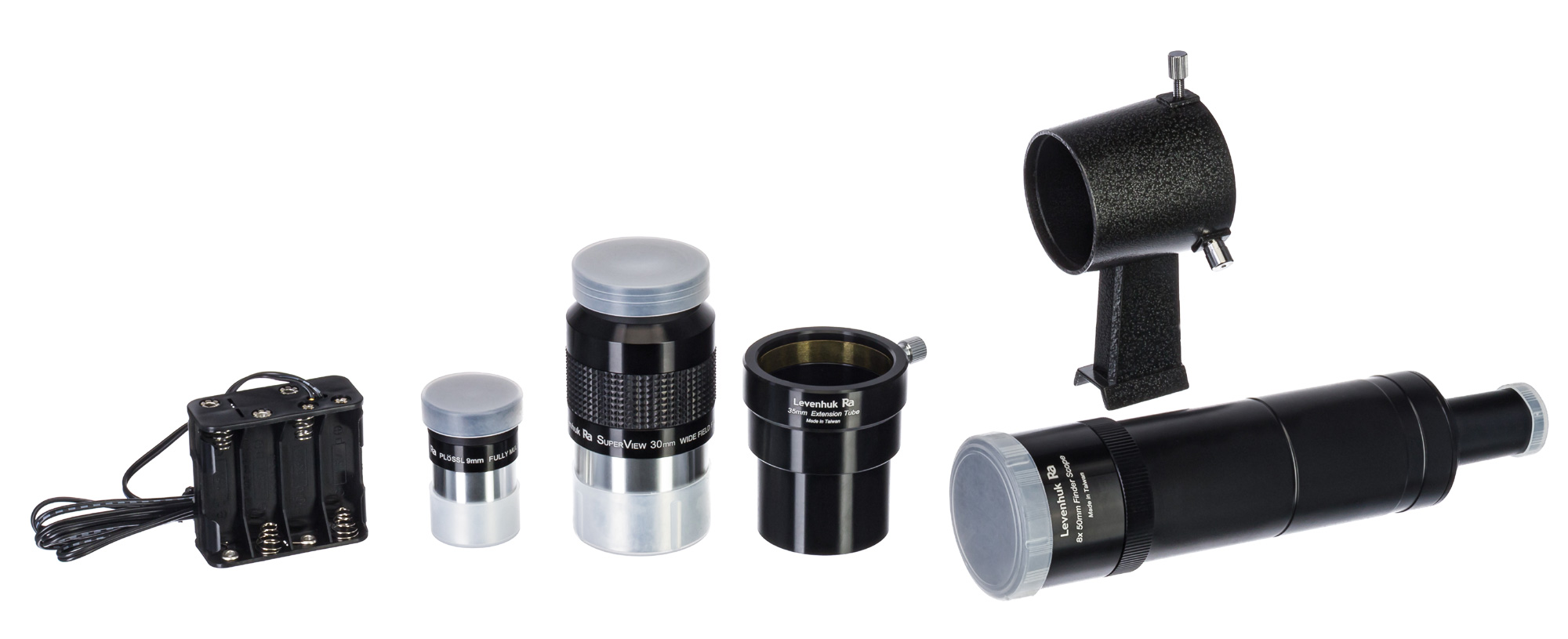 Помимо оптической трубы и монтировки в комплектацию включены оптические аксессуары: окуляр 9 мм, окуляр 30 мм и искатель 8x50 мм. Они позволят сразу приступить к наблюдениям.