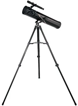 Оптическая труба телескопа достаточно габаритная, так как собрана по схеме рефлектора. Она установлена на азимутальную монтировку, на вертикальной оси которой есть микровинт. С его помощью можно проводить более точную и плавную наводку телескопа на астрономические объекты. Тренога сделана из алюминия, она устойчивая и надежная. Между ножками треноги можно установить полочку для аксессуаров (в комплекте).