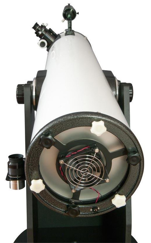 Активное охлаждение оптики выполнено в виде вентилятора на задней стенке оптической трубы, который работает от батареек (приобретаются отдельно). Оно значительно ускоряет термостабилизацию – процесс выравнивания температуры оптики с температурой окружающей среды. Если не дать остывать главному зеркалу (например, при выносе телескопа из дома на холодную улицу оно будет условно горячим), то в картинке будут присутствовать оптические артефакты. Без вентилятора термостабилизация может занимать несколько часов, но для зеркала с активным охлаждением на это требуется в два раза меньше времени.