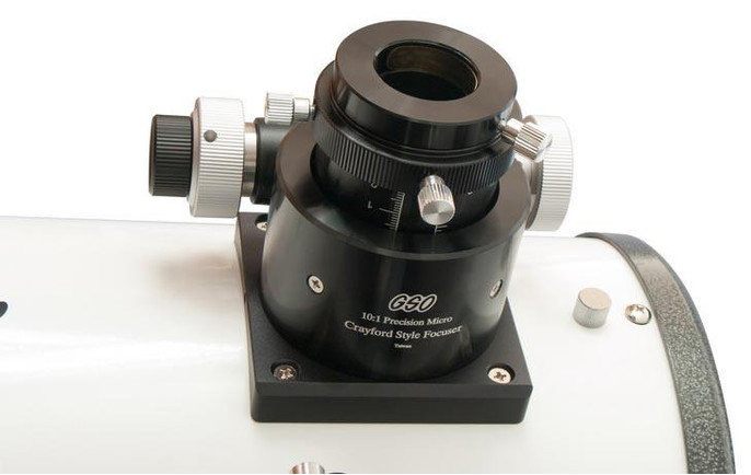 Комплектация телескопа включает оптический искатель с ахроматическими линзами, а также два окуляра. Один – базовый Super Plössl 9 мм с посадочным диаметром 1,25 дюйма, второй – профессиональный 2-дюймовый Erfle 30 мм с широким углом обзора для максимально эффективного изучения дальнего космоса. Также в комплекте есть адаптер-переходник для установки аксессуаров 1,25 дюйма в 2-дюймовый фокусер.