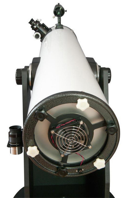 Активное охлаждение оптики расположено на тыльной стороне оптической трубы. Работающий вентилятор примерно в два раза ускоряет термостабилизацию оптики – процесс выравнивания температуры зеркала по температуре окружающей среды. Если этого не делать, то любой рефлектор Ньютона будет вносить в картинку сильные оптические искажения. Без активного охлаждения процесс может занимать несколько часов, но телескоп GSO Dob 12" Delux справляется с задачей много быстрее. Для работы вентилятора требуются батарейки (приобретаются отдельно).