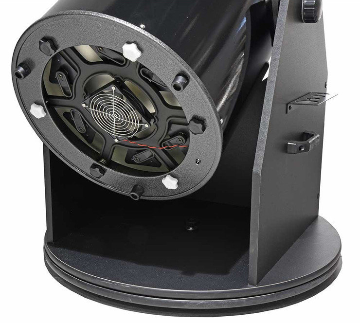 Еще одна особенность этой модели – активное охлаждение главного зеркала. Оно представляет собой вентилятор, расположенный на тыльной стороне оптической трубы. Термостабилизация (охлаждение оптики) очень важна для загородных наблюдений, так как «горячее» зеркало (например, когда телескоп вынесли из теплого помещения на холодную улицу) вносит в изображение сильные искажения. Естественным путем охладить оптику можно где-то за пару часов, но при наличии вентилятора процесс займет в два раза меньше времени. Вентилятор работает от батареек, которые приобретаются отдельно.