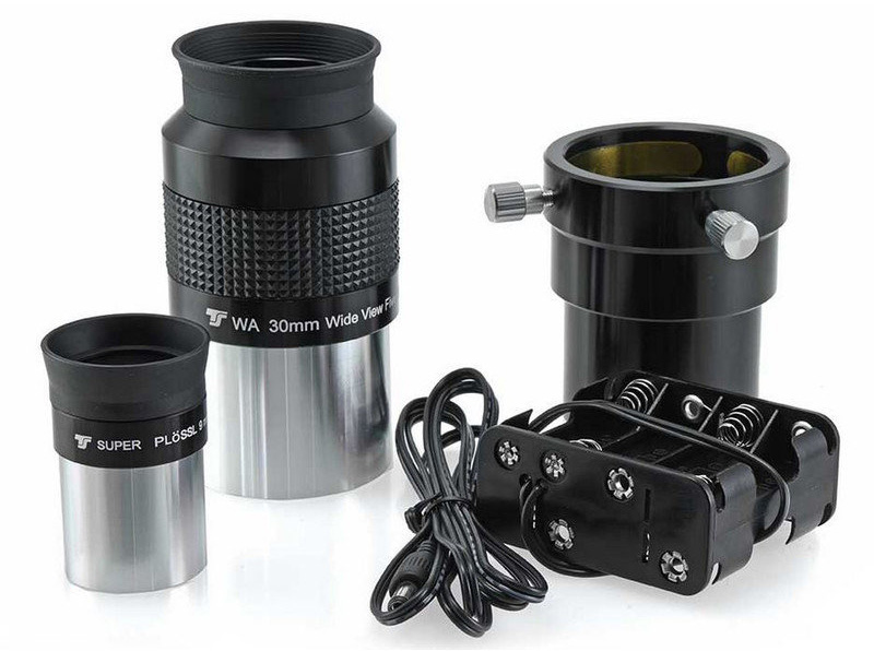 Телескоп дополнен необходимыми аксессуарами: оптическим искателем с ахроматическими линзами, базовым окуляром Super Plössl для прицельных наблюдений, широкоугольным окуляром Erfle 30 мм и адаптером-переходником для установки аксессуаров 1,25 дюйма в фокусер 2 дюйма.