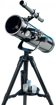 Оптическая схема телескопа – классический рефлектор, причем элементы оптики сделаны из стекла, что не так часто встречается, так как в игрушечные телескопы обычно ставят пластик. Труба телескопа устанавливается на азимутальную монтировку, которая, в свою очередь, крепится к алюминиевой треноге. Так как прибор создан специально для детей, тренога имеет чуть меньшую высоту, чем у «взрослых» телескопов. Между ножками треноги можно закрепить полочку для аксессуаров.