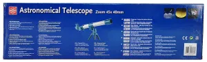 Оптическая труба EDU-TOYS 45x (TS808) – это классический рефрактор, тренога представляет собой устойчивый треножник с регулируемой по высоте центральной частью. Монтировка азимутальная, самой простой конструкции.