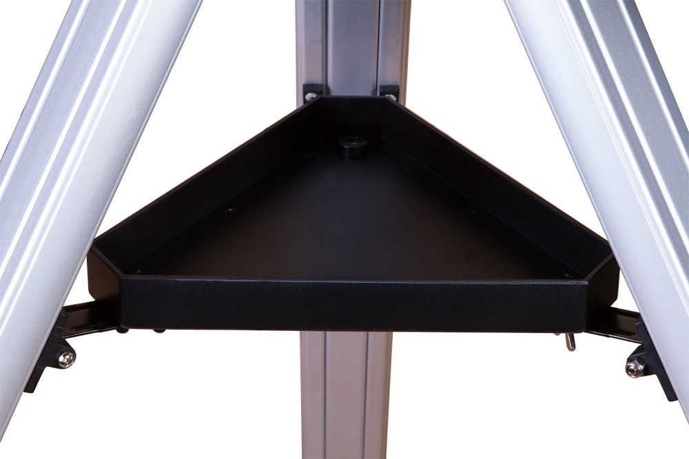 Телескоп комплектуется азимутальной монтировкой, и для ее освоения не потребуется много времени. Levenhuk Skyline BASE 100S управляется как классическая зрительная труба, перемещением оптической трубы влево, вправо, вверх и вниз. Монтировка фиксируется на стандартной треноге, которая сделана из алюминия и надежно устанавливается даже на неровные поверхности. Есть лоток для аксессуаров. Высоту ножек треноги можно регулировать.
