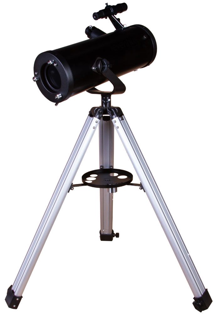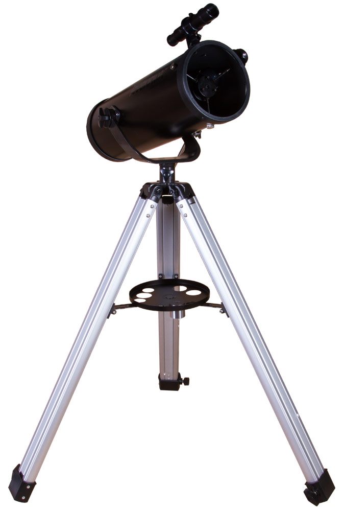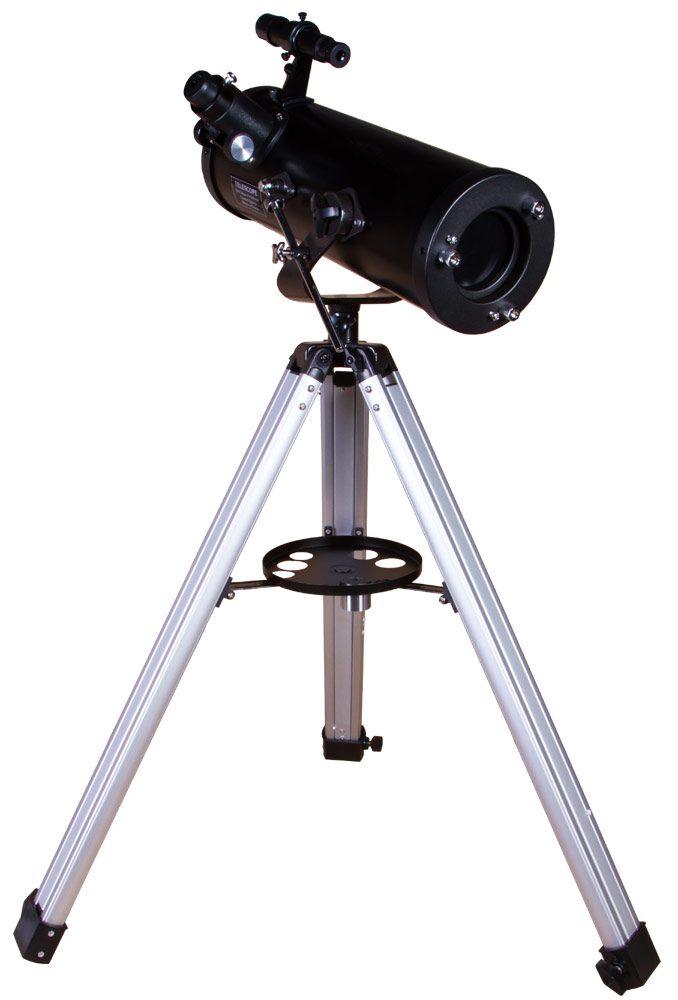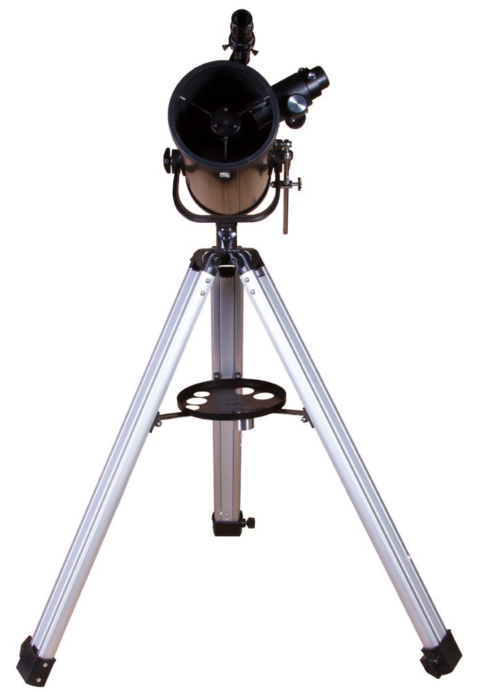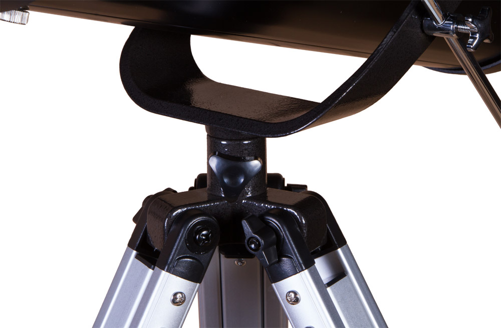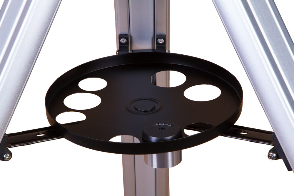 Управлять телескопом легко. Прибор устанавливается на азимутальную монтировку, которая позволяет перемещать оптическую трубу как обычную зрительную – вверх, вниз, влево и вправо. Монтировка фиксируется на треноге стандартной конструкции. Тренога сделана из алюминия и прочно стоит даже на неровных поверхностях. На нее можно установить лоток для аксессуаров.