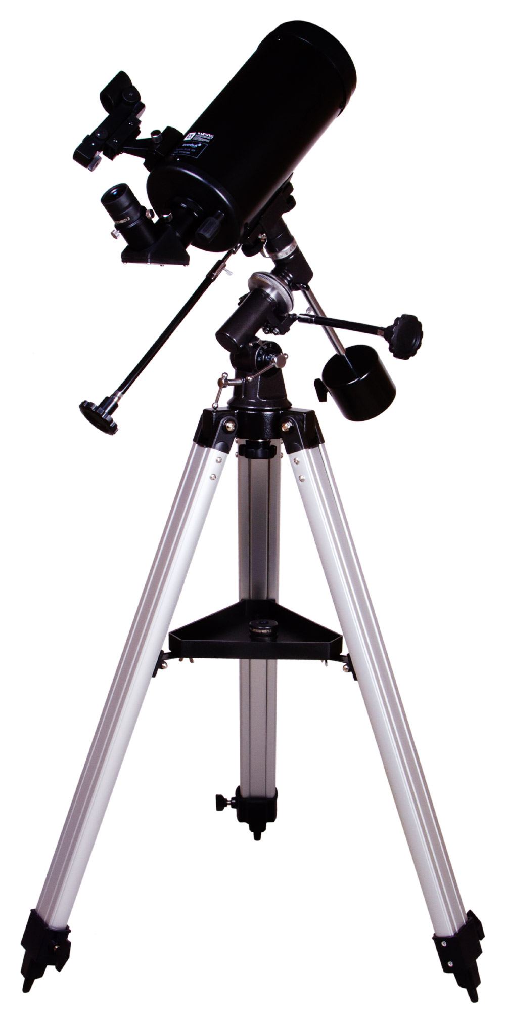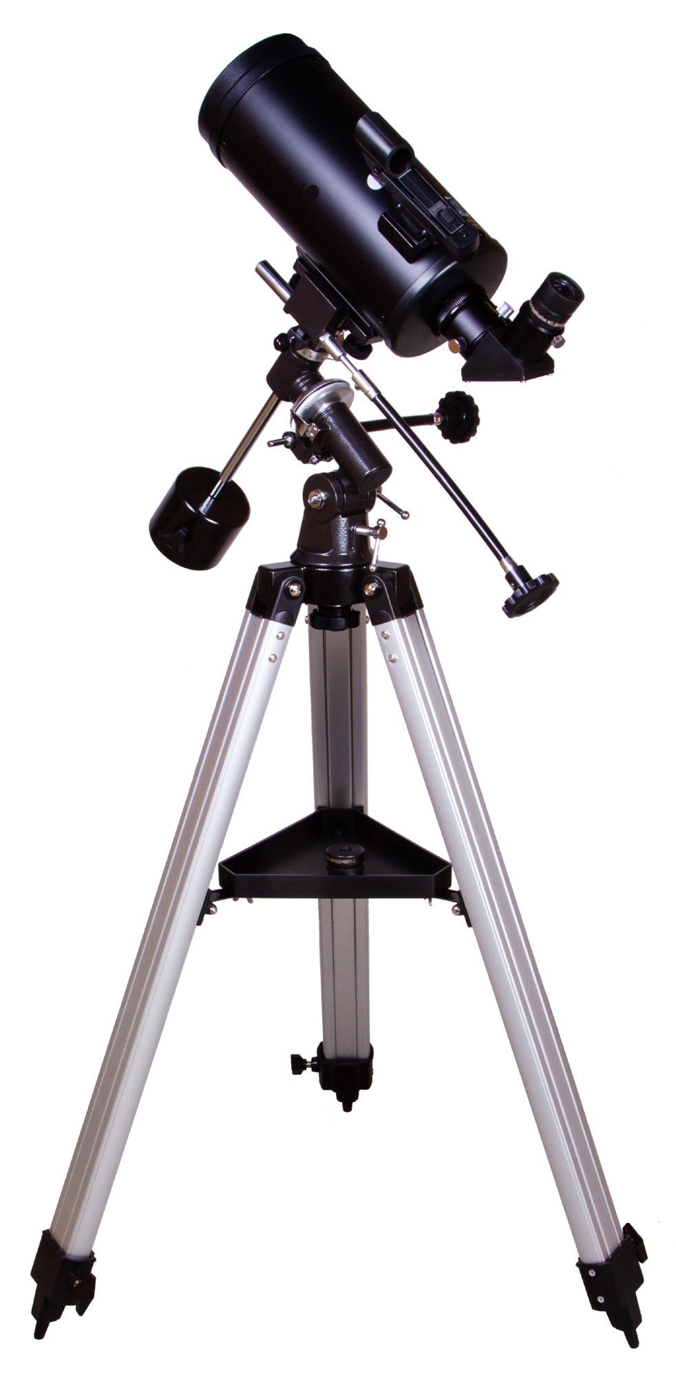 Телескоп устанавливается на устойчивую алюминиевую треногу. Высоту ее ножек можно регулировать. На лотке для аксессуаров можно разместить комплектные и дополнительные приспособления. В коробке вы найдете два разнофокусных окуляра, обеспечивающих среднее приближение, и диагональное зеркало, которое используется для ландшафтных наблюдений.
