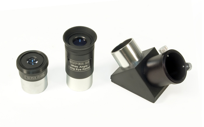 С телескопом поставляются 2 окуляра. Линзы окуляров изготовлены из стекла и имеют многослойное просветление. Фокусировка выполняется подвижкой главного зеркала с помощью удобной ручки с плавным ходом. С помощью дополнительных окуляров увеличение телескопа может быть поднято до полезного предела в 250 крат.
