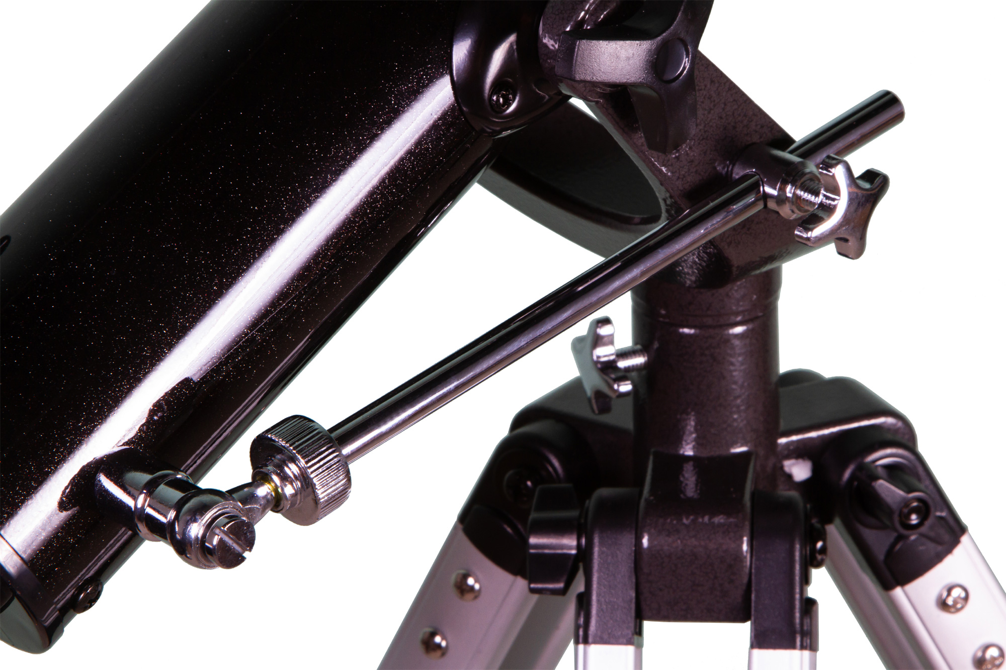 Телескоп установлен на азимутальную монтировку AZ2. Она простая в управлении, не требует никакой дополнительной настройки. На обеих осях есть стопорные винты, а на вертикальной оси – микрометрический винт. Управление ручное: оптическую трубу можно перемещать вверх-вниз и вправо-влево.