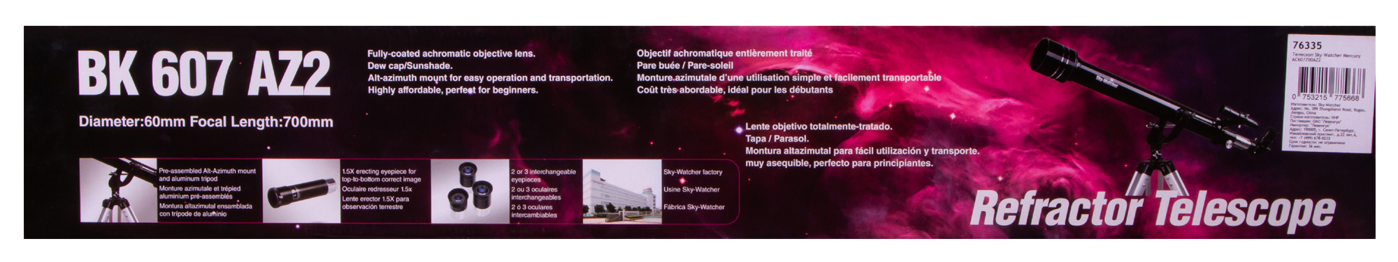Телескоп Sky-Watcher BK 607AZ2 – это ахроматический рефрактор с апертурой 60 мм. Он собирает в 70 раз больше света, чем глаз человека. Благодаря этому в него можно увидеть Луну, Сатурн, Юпитер, Марс и другие объекты ближнего космоса. Телескоп подходит и для ландшафтных наблюдений, т. е. может использоваться в качестве мощной зрительной трубы. Телескоп Sky-Watcher BK 607AZ2 – прекрасный подарок начинающему астроному любого возраста!