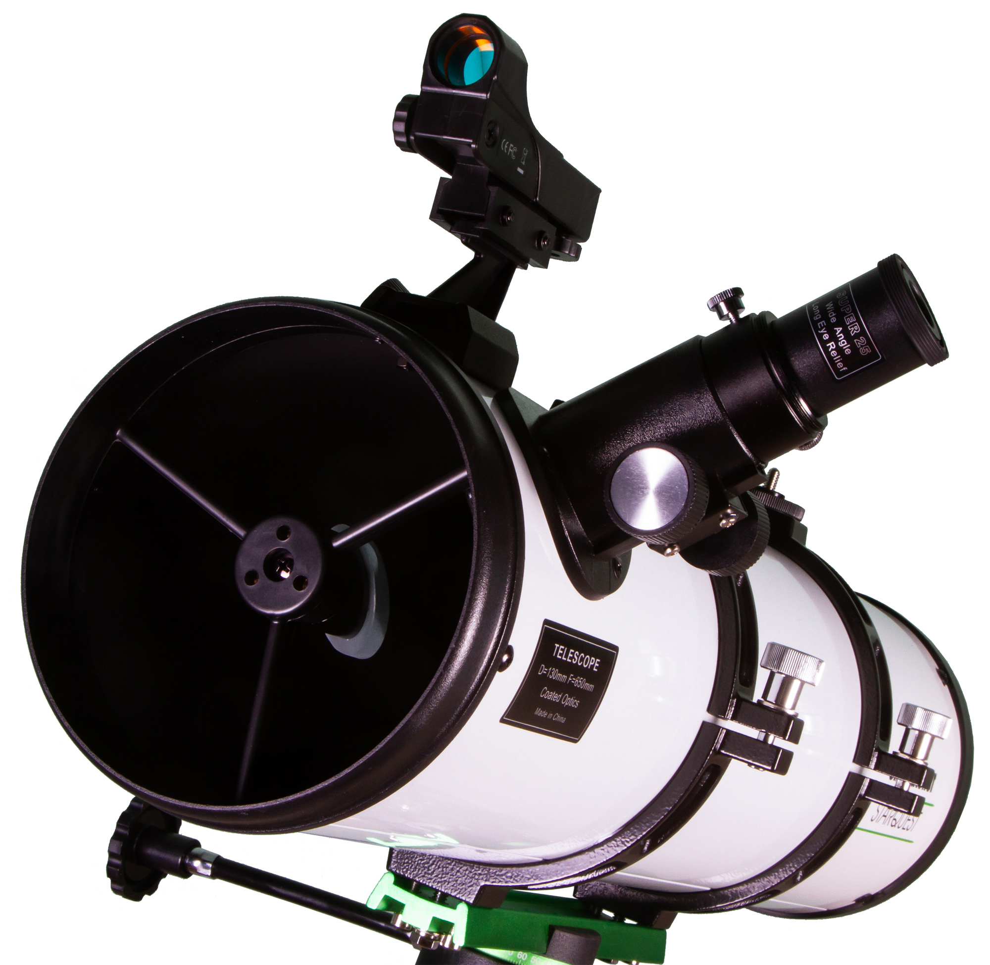 Благодаря 130-миллиметровому объективу телескоп эффективно собирает свет – на 30% лучше, чем аналогичные модели с апертурой 114 мм. Фокусное расстояние небольшое, поэтому оптическая труба достаточно компактная, что делает телескоп более устойчивым и легкоуправляемым. В комплект поставки включены базовые оптические аксессуары: два разнофокусных окуляра и искатель с красной точкой. Зеркало не юстируется.