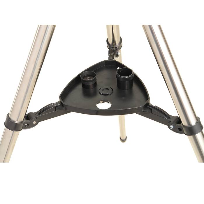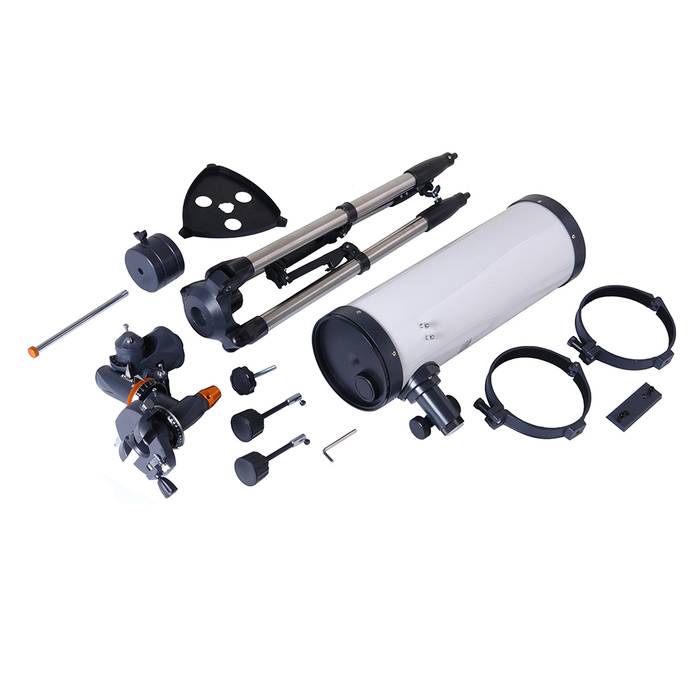 Очень стильное исполнение телескопа: белая глянцевая металлическая труба в обрамлении черных крышек и колец, детали монтировки немецкого типа EQ5 окрашены в оранжевый цвет. Удобный искатель (увеличение 6х) расположен рядом с окуляром. Мощный, красивый, устойчивый штатив из полированной нержавеющей стали с дополнительными распорками, на которые устанавливается полочка для аксессуаров.