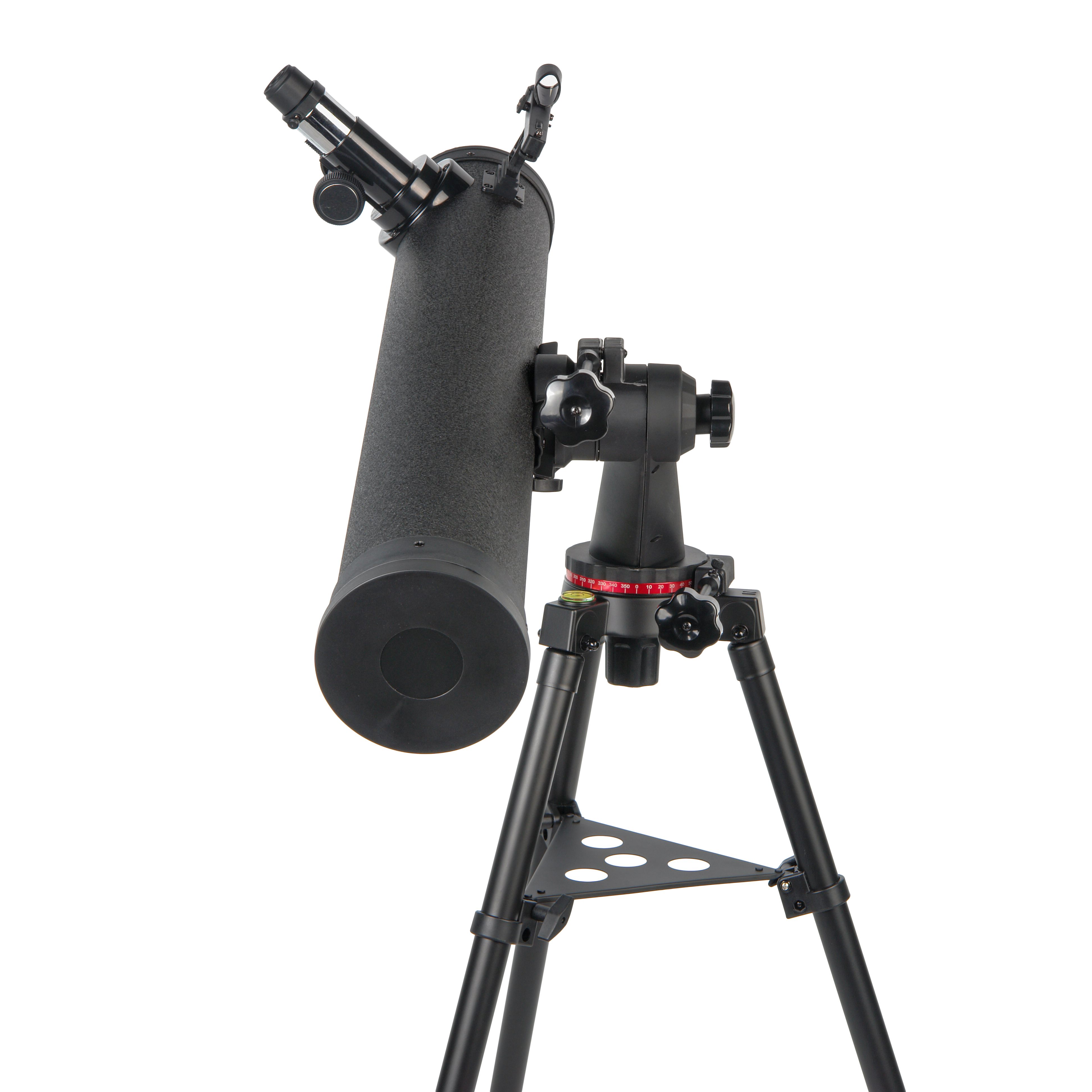 Высота металлического штатива-треноги регулируется от 72 см до 124 см за счет телескопической конструкции с винтовыми фиксаторами. Пластиковые опоры на ножках не позволяют штативу царапать поверхность пола. При использовании телескопа в «полевых» условиях пластиковые опоры выкручиваются вверх и штатив устанавливается на неровную поверхность на «шипах». Для точного выравнивания штатива сверху на корпусе размещен крупный пузырьковый уровень диаметром 25 мм, а для придания устойчивости крепится растяжка с лотком, служащая одновременно полочкой для окуляров.