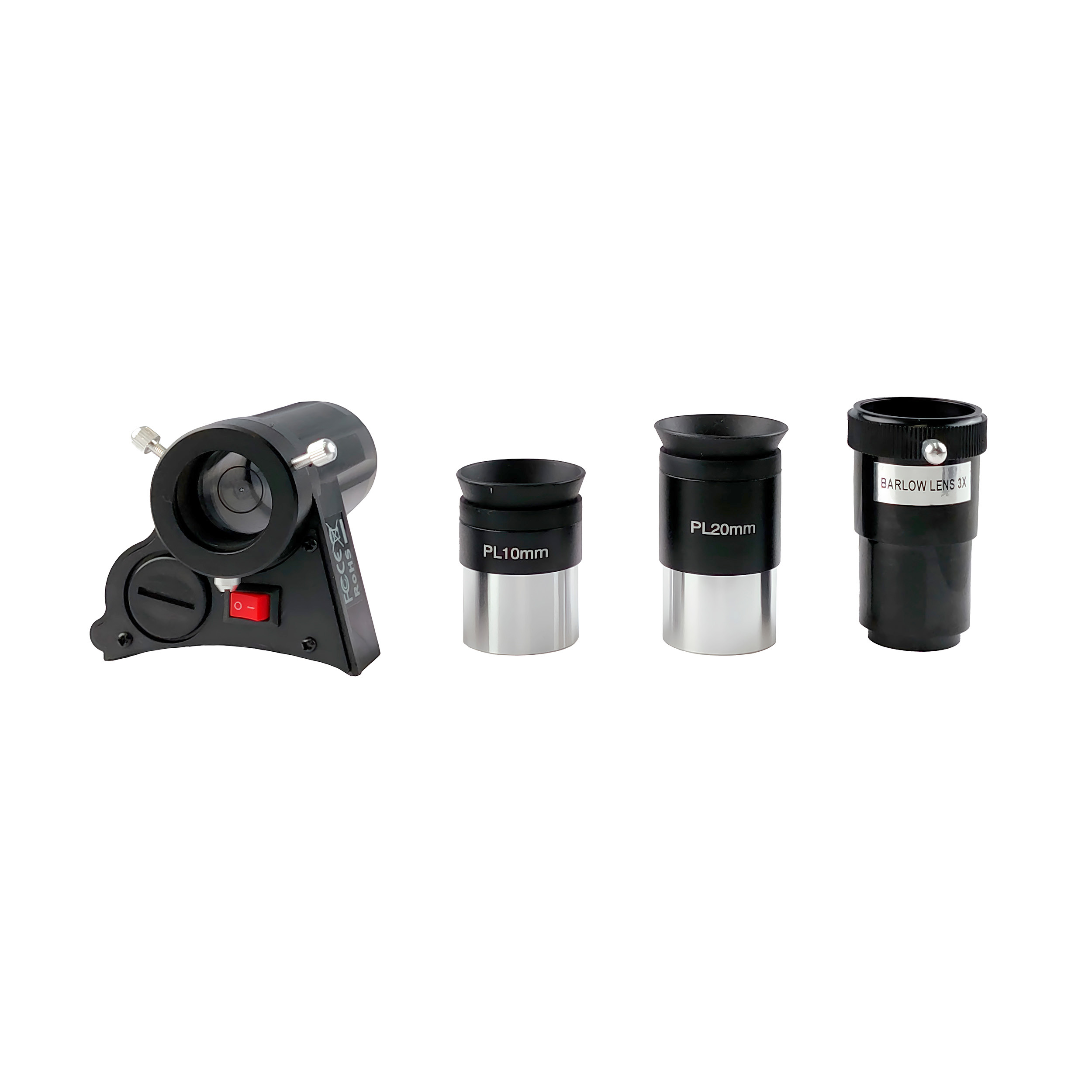 Окуляры Pl10, Pl20 системы Плёсл позволяют наблюдать четкое изображение практически без искажений по всему полю зрения. Кратность увеличения телескопа 50х и 25х может быть увеличена при использовании комплектной линзы Барлоу с 3х увеличением до 150х и 75х.