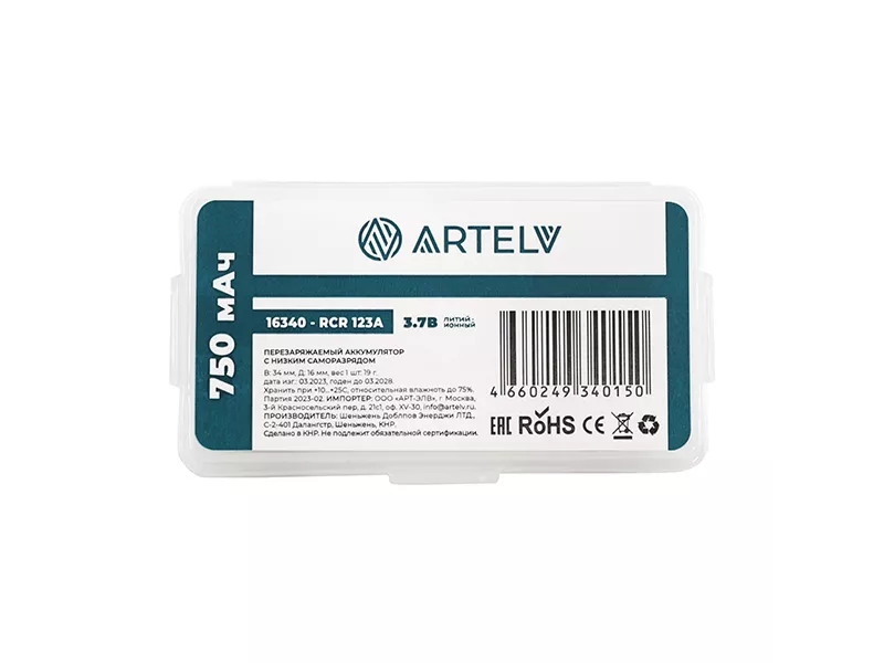 Аккумуляторная батарея RCR123 ARTELV 3.7V Li-Ion 750 mAh