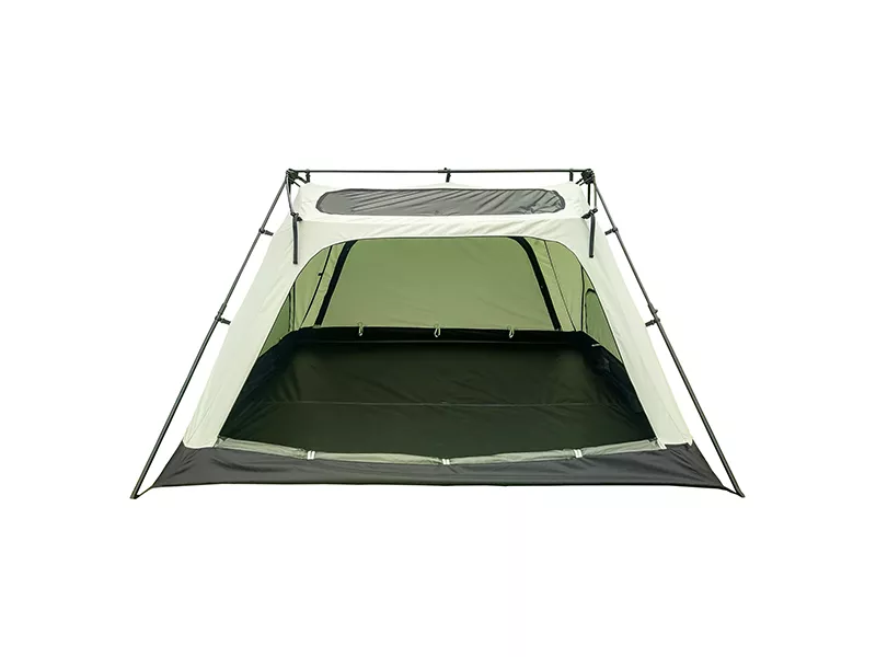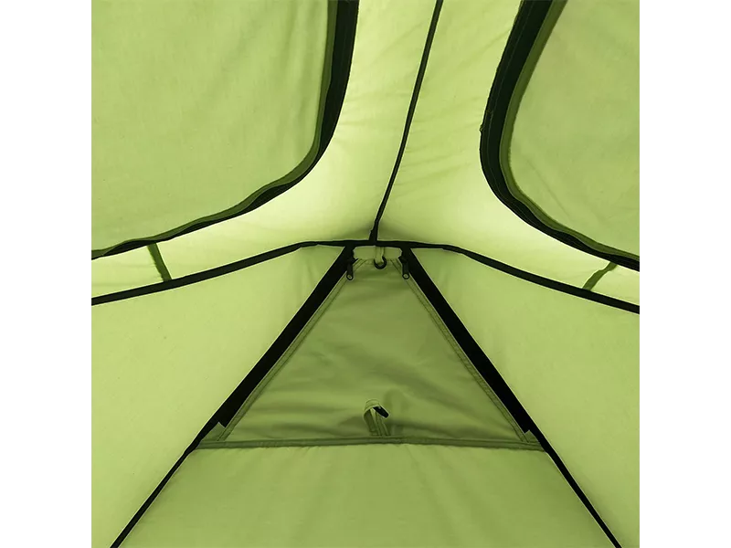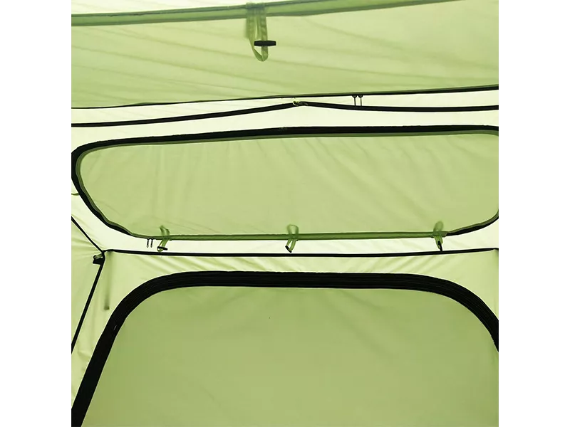 Мягкий зеленый оттенок тента маскирует палатку на фоне лесного ландшафта, задает внутри приятное освещение в солнечный день. Черный пол контрастирует со стенами и потолком, создает ощущение чистоты и комфорта.