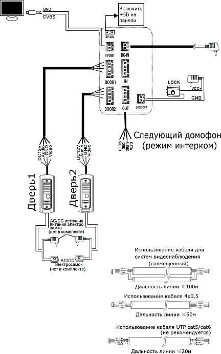 - Возможности подключения До 2х вызывных панелей, до 6ти мониторов