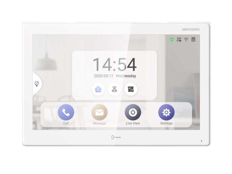 DS-KH9510-WTE1 – IP Видеодомофон на операционной системе Android. Монитор домофонной системы с IPS сенсорным экраном 10.1 дюймов. Разрешение дисплея: 1024 * 600. RJ45 10/100 Мб/с Ethernet, Wi-Fi: IEEE802.11b/g/n, стандартное PoE / 12 В пост. 8 тревожных входов, два тревожных выхода, RS-485. Встроенный Hik-Connect для комплексного управления. Поддерживает установку до 3-х приложений Android. Встроенный всенаправленный микрофон; 8Гб внутренней памяти; Рабочая температура -10° ~ +50° С.