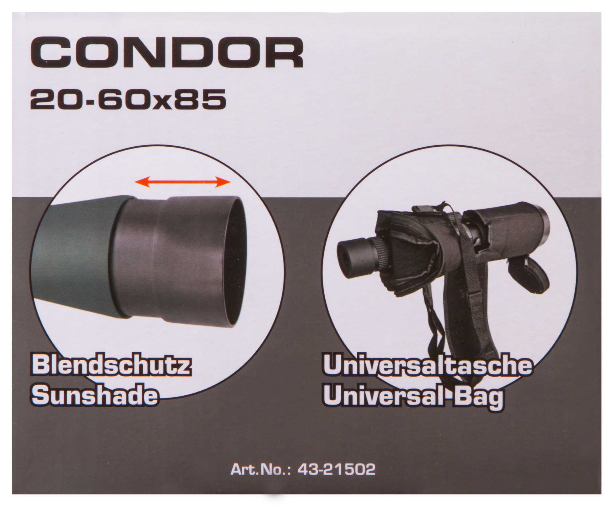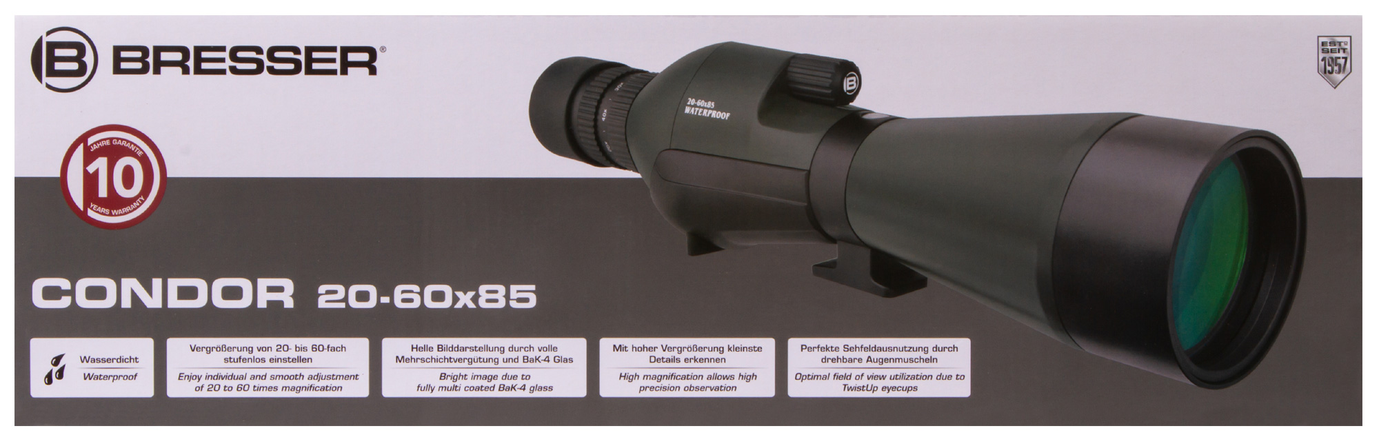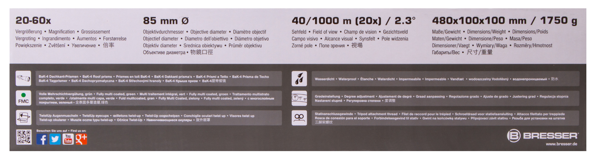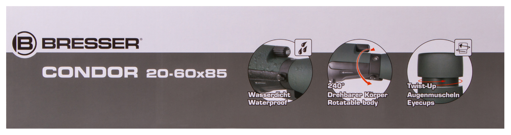 Для получения максимально стабильной картинки Bresser Condor 20–60x85 желательно устанавливать на штатив (нет в комплекте). Подойдет любой DIN-штатив с резьбовым креплением 1/4" и грузоподъемностью от 3 кг и выше.