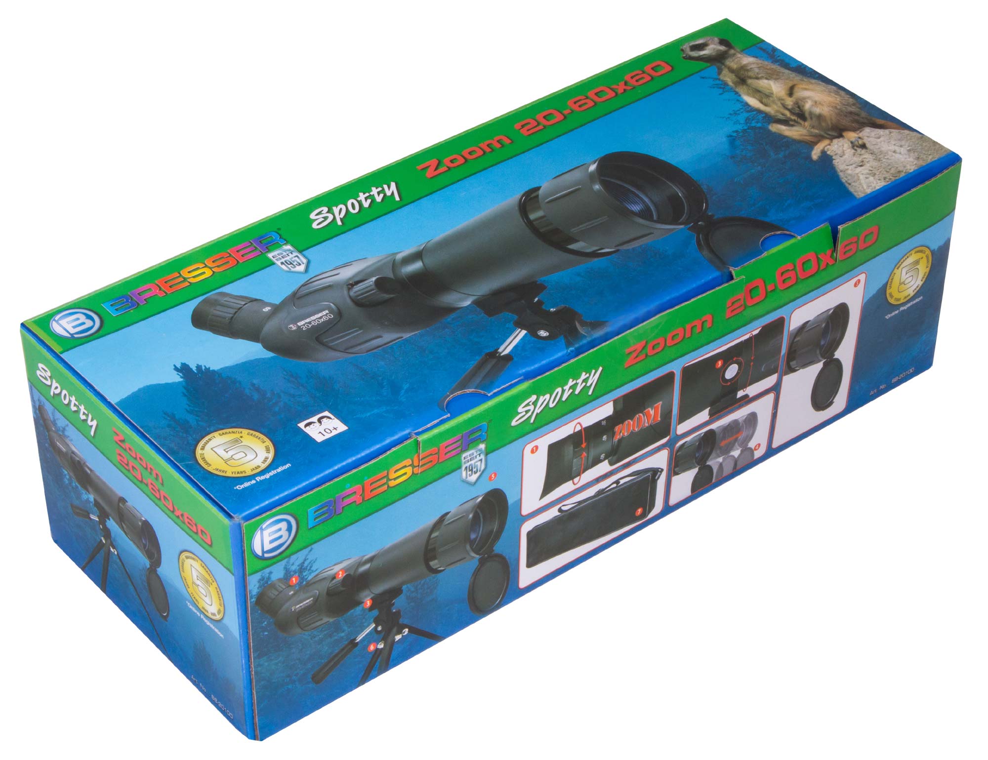 Bresser Junior Spotty 20–60x60 – детская зрительная труба с невероятными для этого класса оптических приборов возможностями. В ней установлен панкратический объектив, позволяющий выбирать любое увеличение в диапазоне от 20 до 60 крат. Диаметр объектива составляет 60 мм, поэтому оптика собирает достаточно света, чтобы можно было вести наблюдения в сумерках. А наклонно расположенный окуляр хорошо подходит для изучения околозенитной области. Bresser Junior Spotty 20–60x60 – отличный выбор для юного натуралиста.