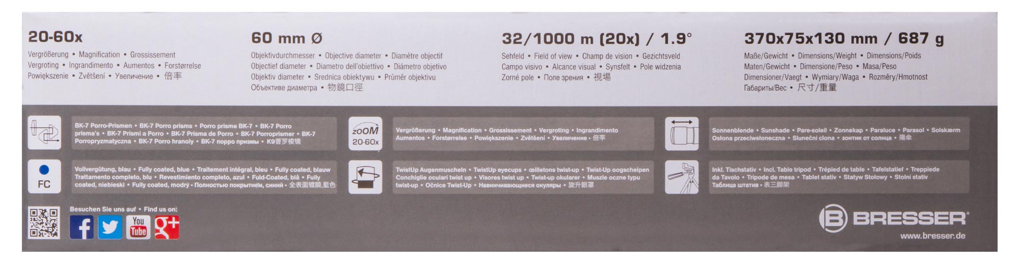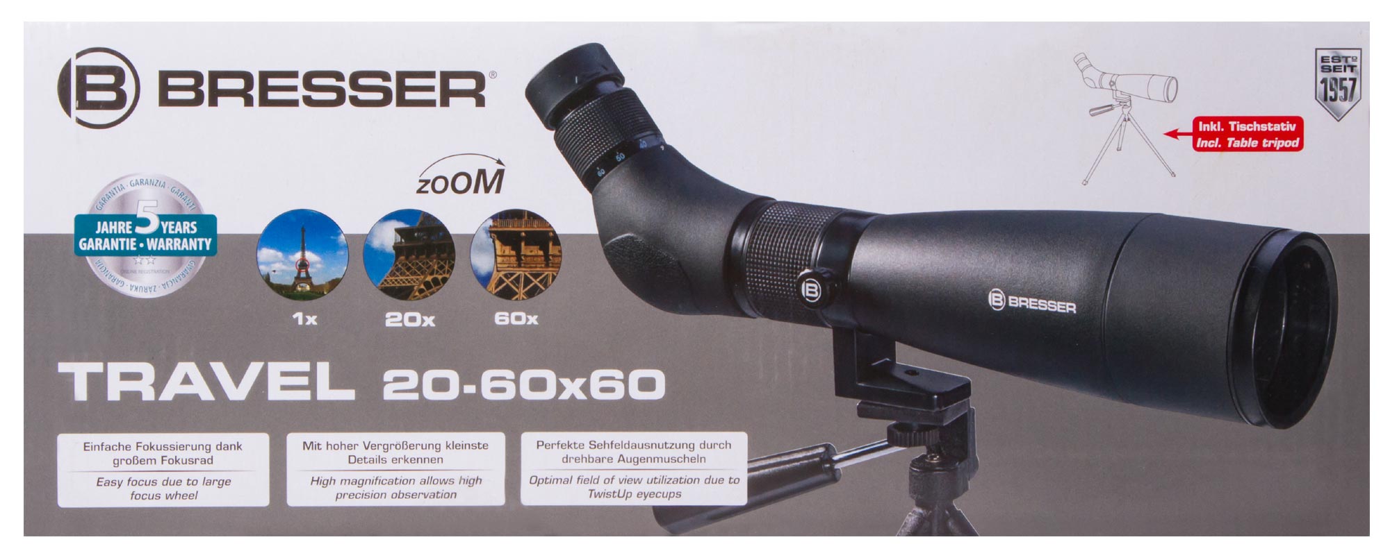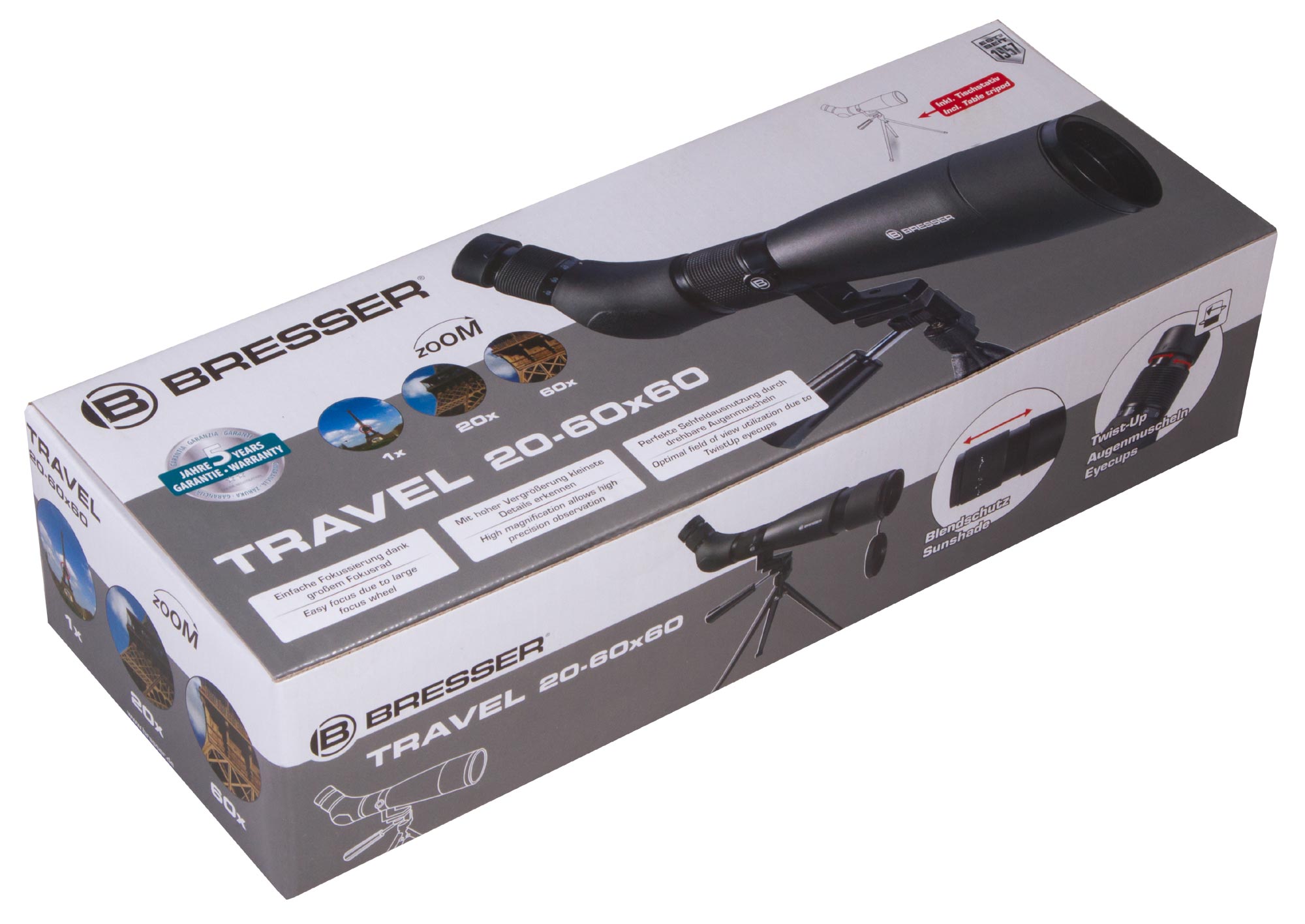 В зрительной трубе Bresser Travel 20–60x60 установлен панкратический объектив, который позволяет плавно изменять увеличение в диапазоне от 20 до 60 крат. Благодаря этому при наблюдениях можно или сосредоточиться на деталях сильно удаленных объектов, или одним взглядом охватить широкую область. Окуляр трубы расположен наклонно, что позволяет с максимальным комфортом изучать околозенитную область. Зрительная труба Bresser Travel 20–60x60 – отличный выбор для наблюдений за полетами птиц, изучения повадок животных или природных пейзажей. Ее можно использовать и для просмотра спортивных мероприятий на стадионе.